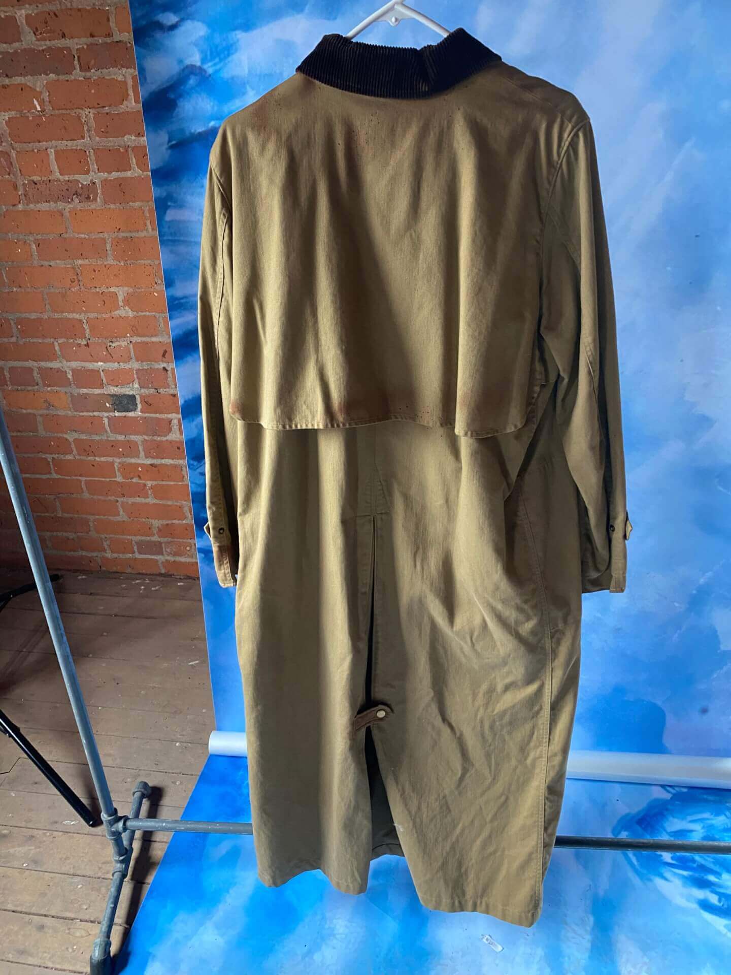 Men’s light brown trench coat with solid brown corduroy collar