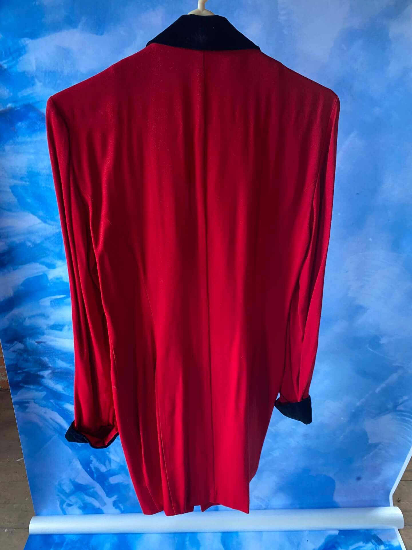 Women’s bright red coat with black buttons and collar