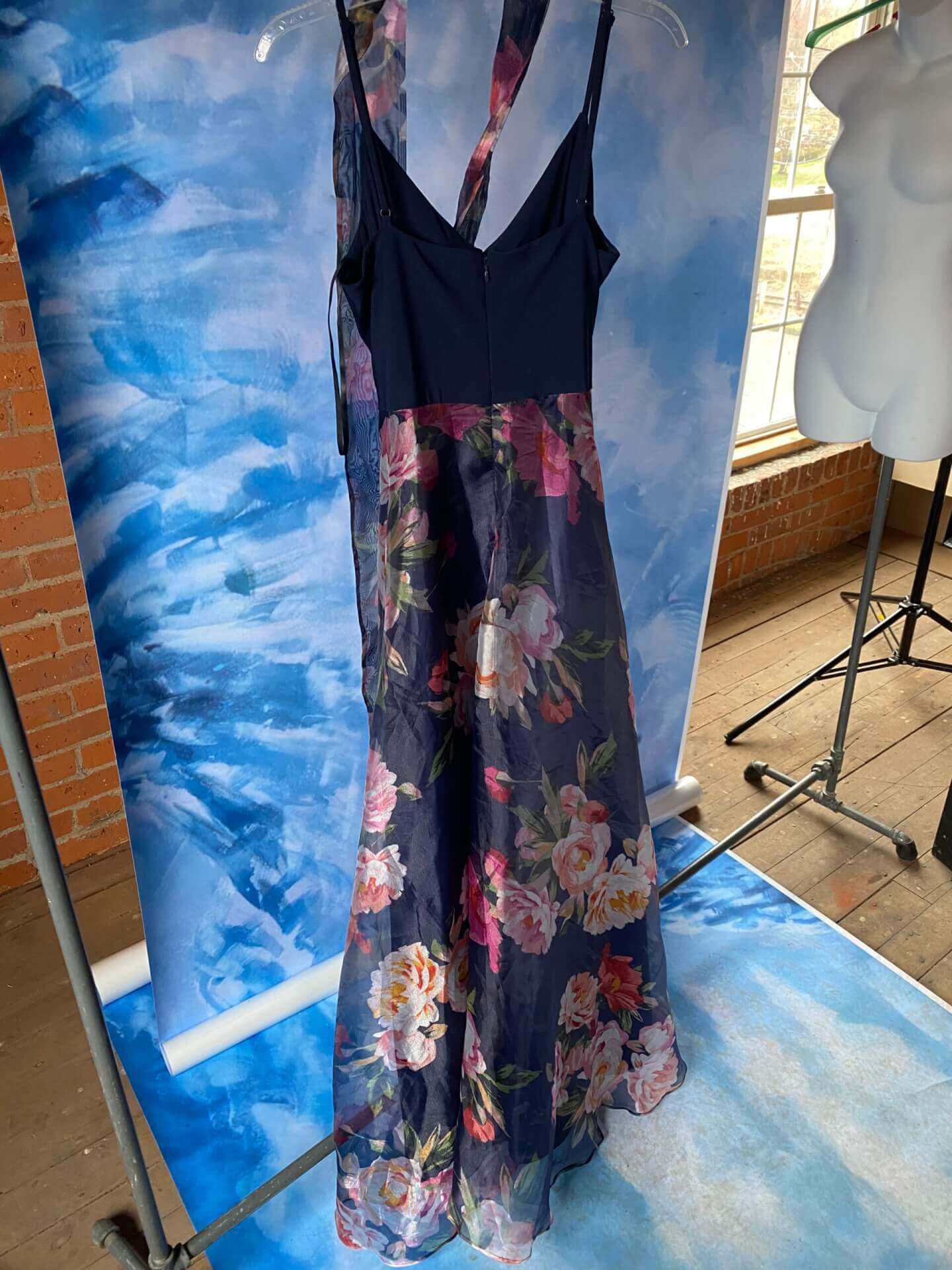 Women’s sleeveless dress with dark blue top and flowered skirt