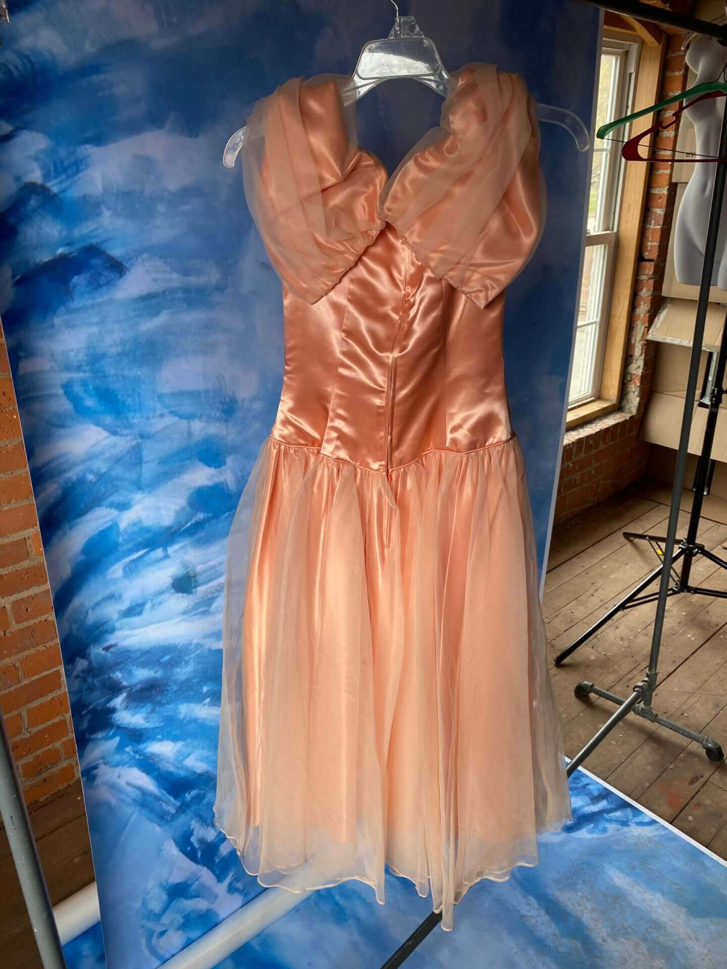 Women’s tea length peach colored dress with tafetta skirt