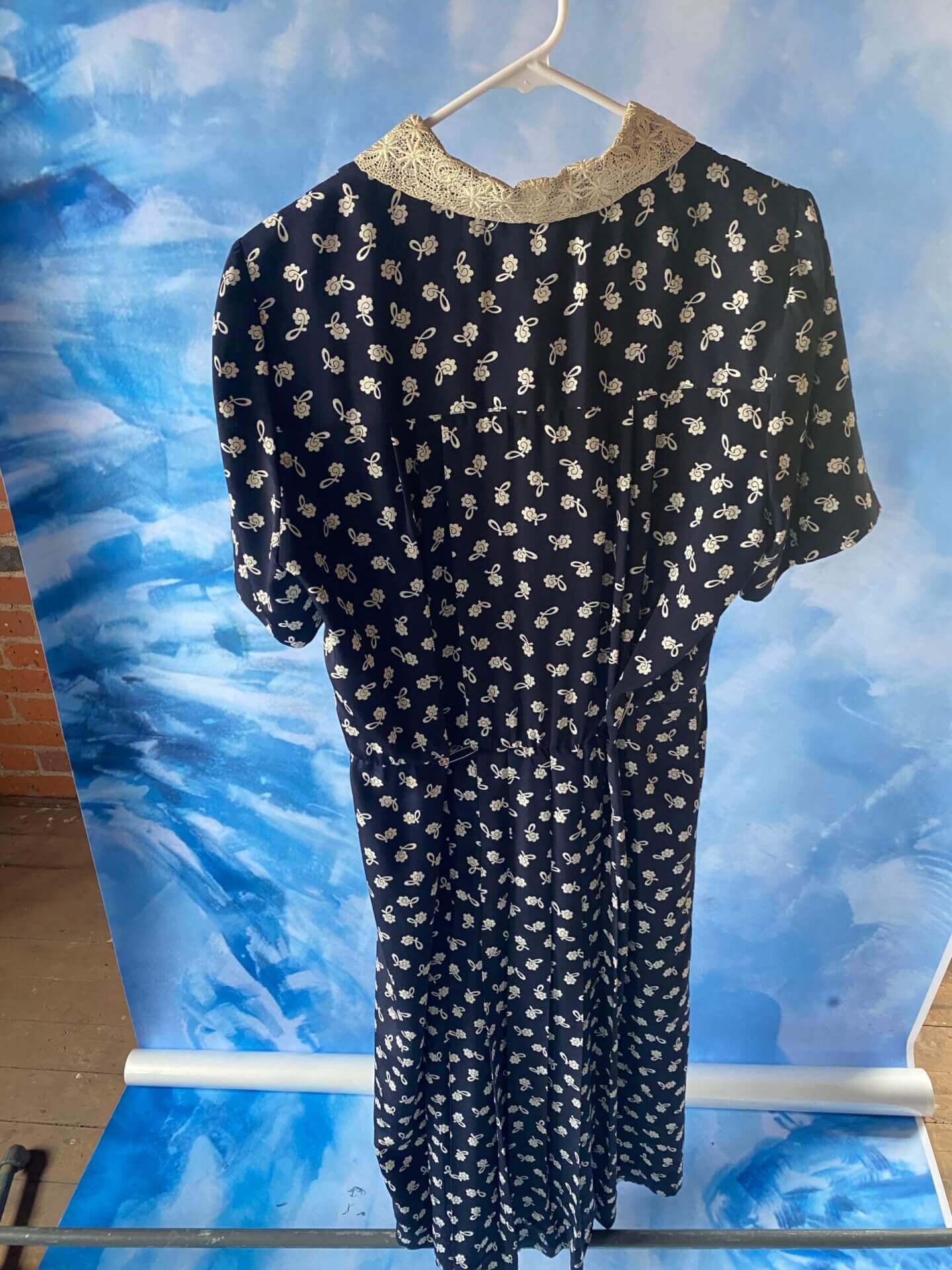 Women’s blue/black floral print dress with lace collar