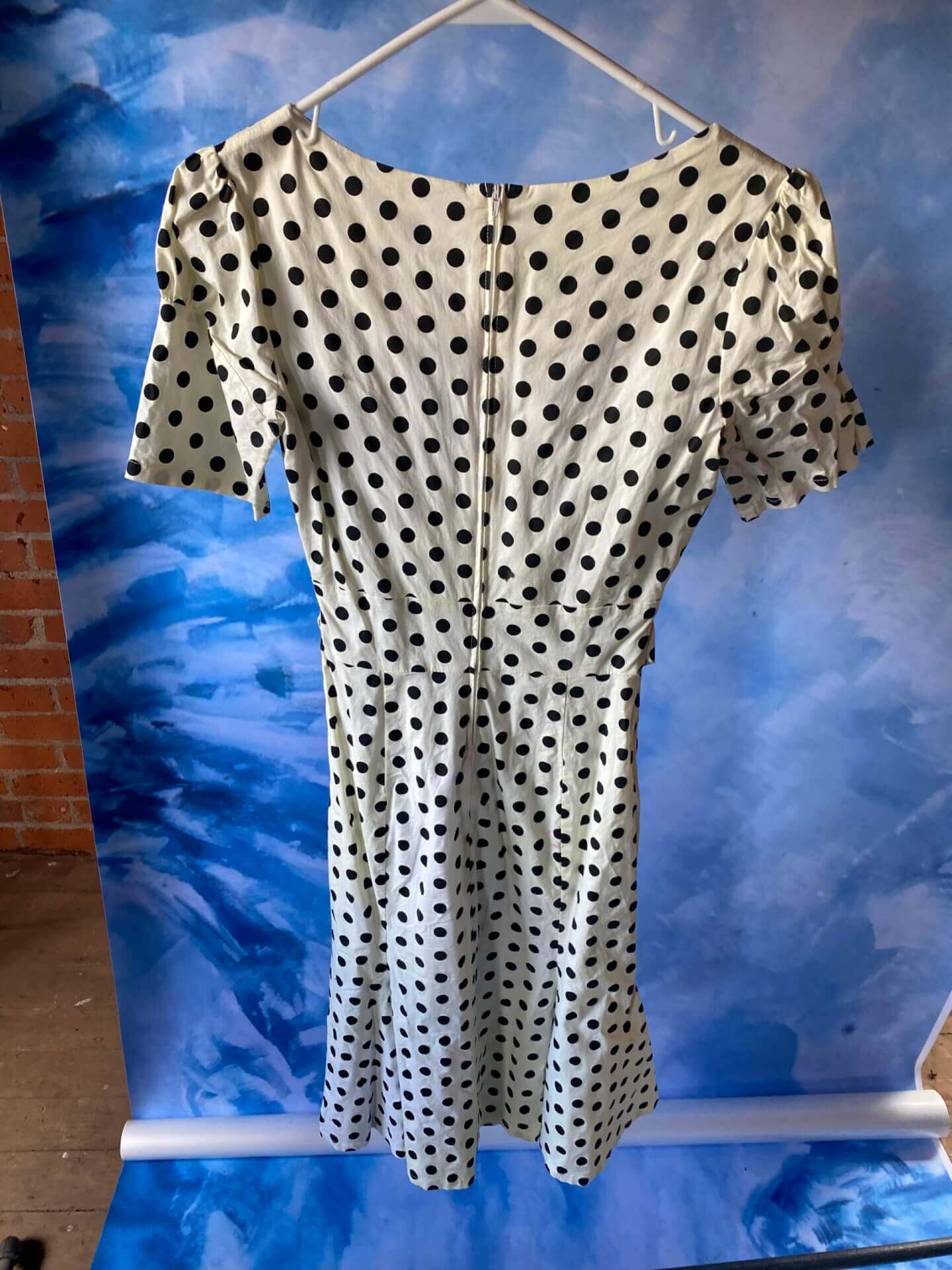 Women’s white dress with black polka dots and a belt