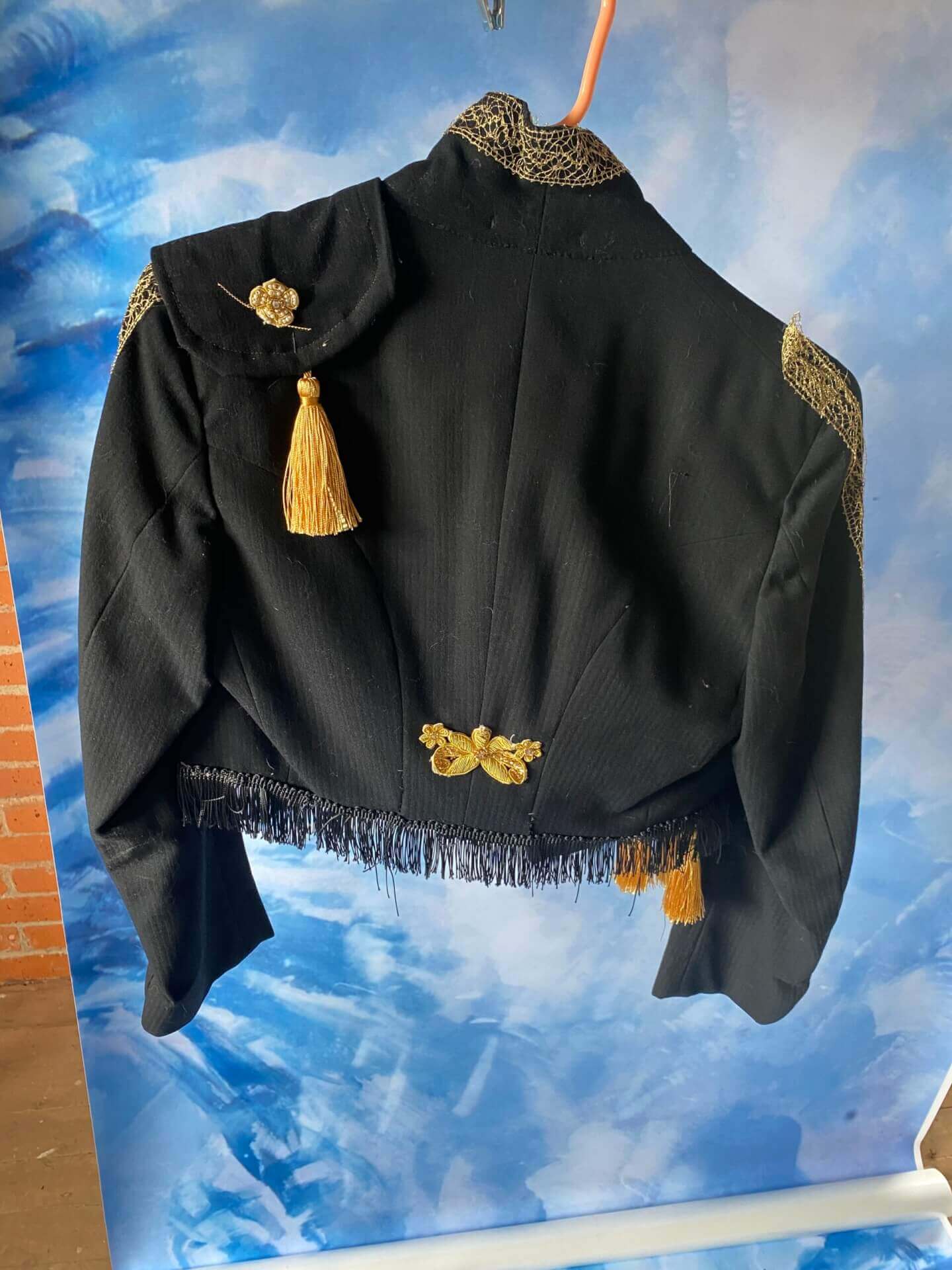 Women’s two piece, black pants and black circus wear/show master fringed jacket with gold details