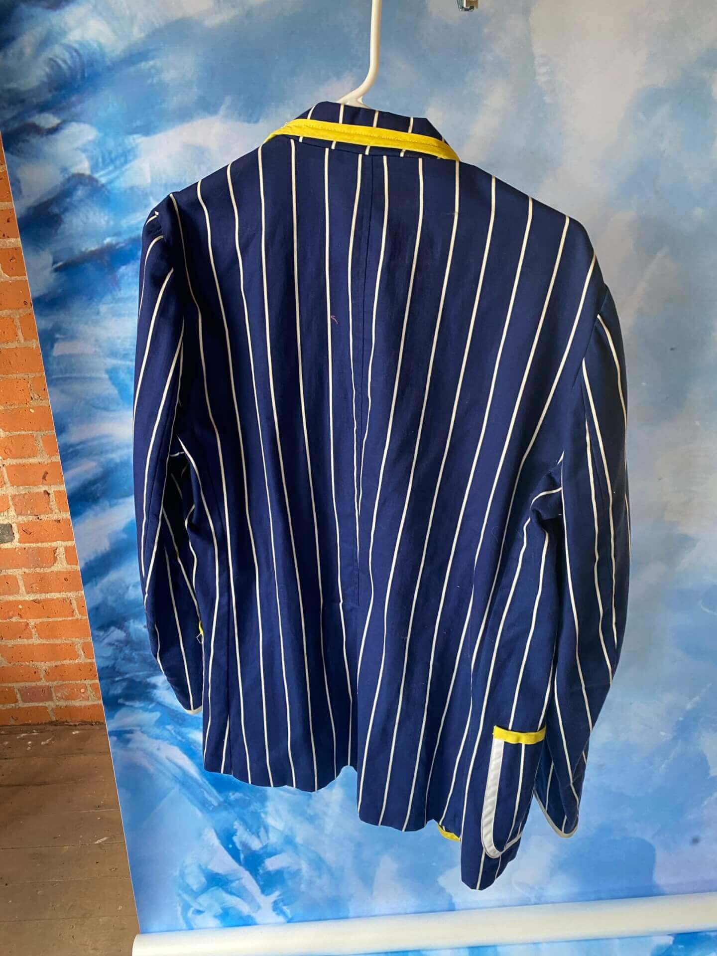 Unisex dark blue pinstripe jacket with yellow piping