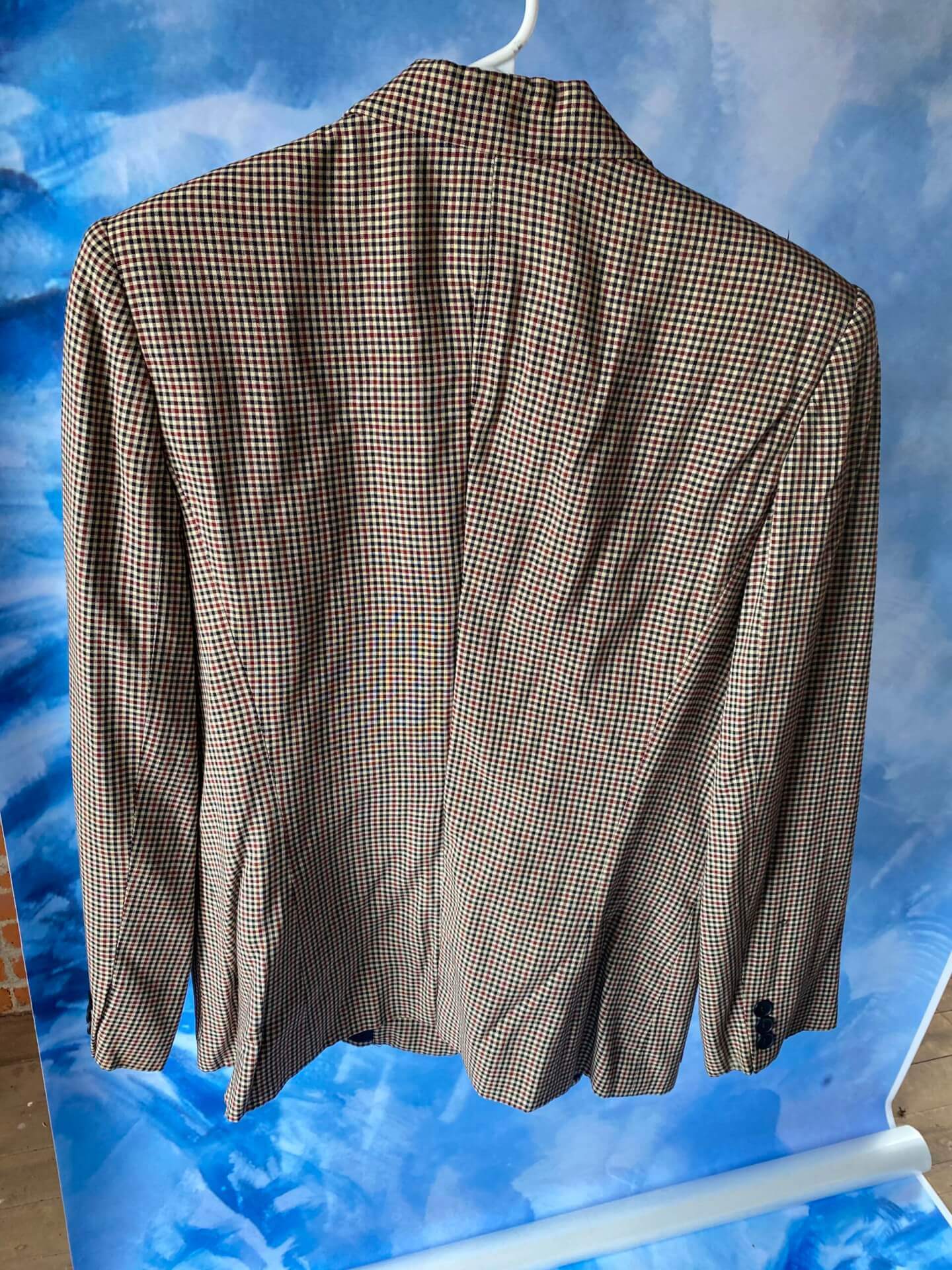 Women’s checked jacket, eggshell white, black and maroon with black buttons