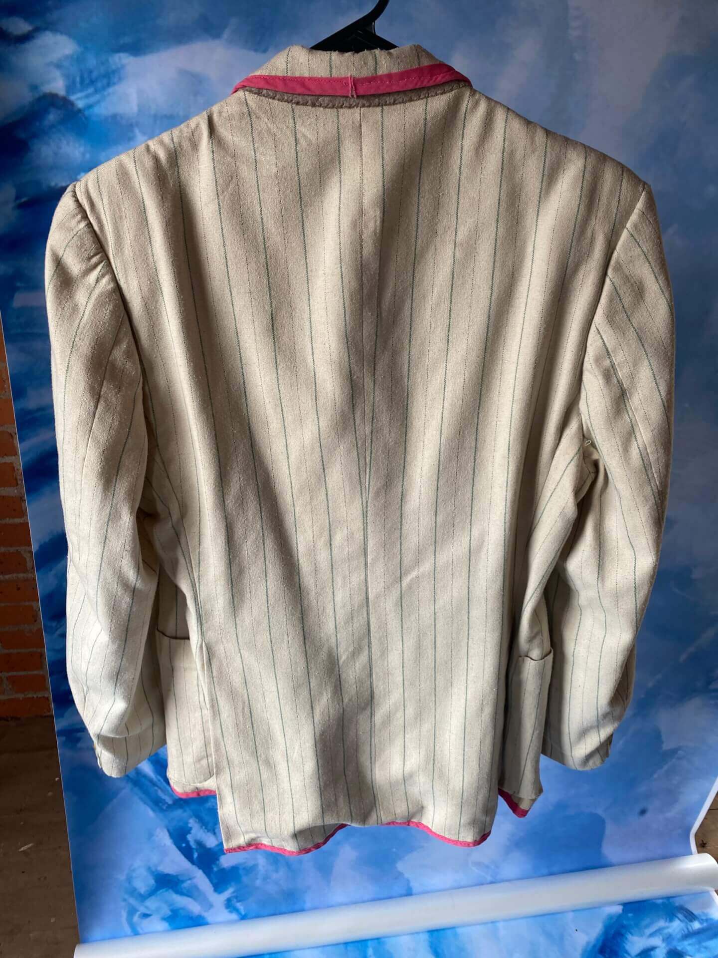 Women’s cream jacket with green pinstripes and pink piping on the collar