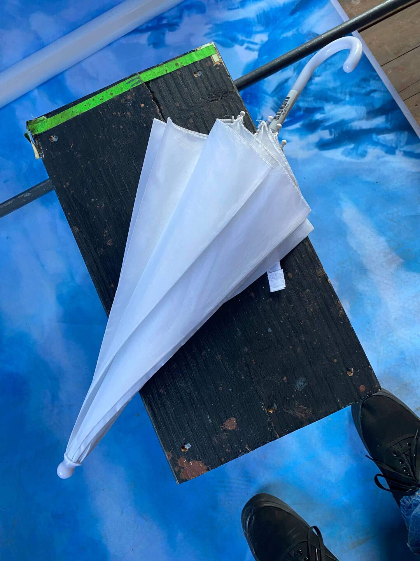 A set of 12 small, white umbrellas approximately 28″ in diameter extended and 21″ long closed. One of the set is missing its decorative top knob.